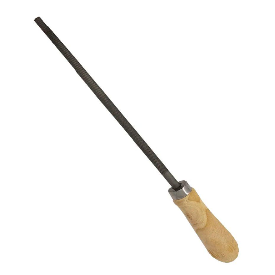 Lima feita de aço carbono, com cabo de madeira, que é coberto com um verniz incolor que protege a madeira.