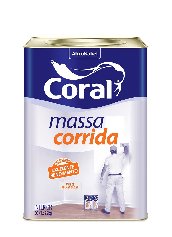 Para proteger e manter sua pintura bonita e nova por muito mais tempo é necessário fazer uma boa preparação da superfície. A Massa Corrida Coral é indicada para uniformizar, nivelar e corrigir pequenas imperfeições em superfícies internas de alvenaria e concreto. Com alto poder de enchimento, elevada consistência, ótima aderência, sua secagem é rápida e seu odor é baixo. De consistência cremosa, também é mais fácil de aplicar, econômica e mais resistente. Sua fórmula proporciona também proporciona uma maior facilidade para lixar. Uma lata de 25KG rende até 75m² por demão (Rendimento estimado. Pode variar de acordo com o tipo e condição da superfície).