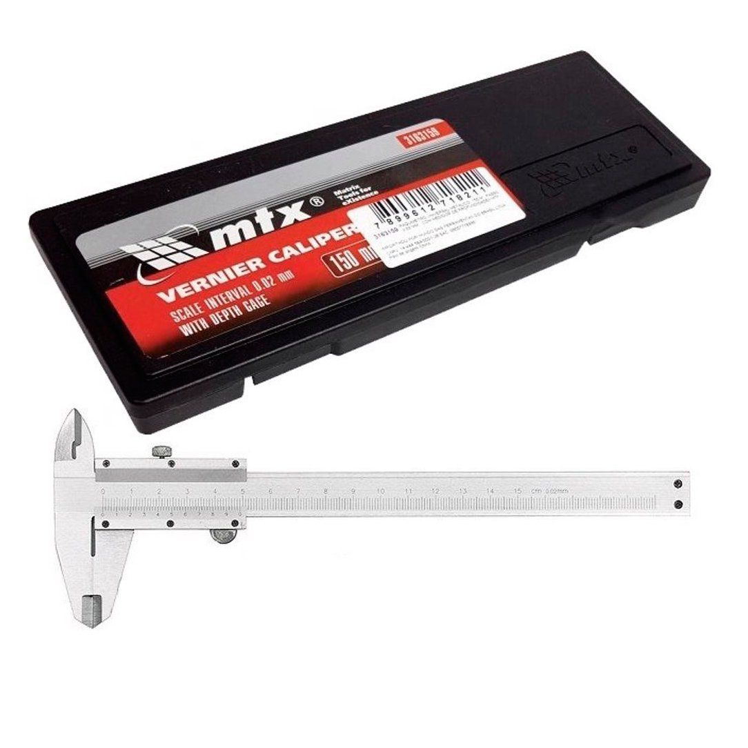 Paquímetro Analógico MTX de Aço 150mm Descrição do Produto: PAQUÍMETRO METÁLICO, 150 M , PASSO 0,02 MM, COM MEDIDOR DA PROFUNDIDADE// MTX O paquímetro é feito de aço carbono. Deslocando o cursor móvel sobre a haste da ferramenta. Erro de medição é de 0,02 mm (100 mm) 0,03 mm (100–200 mm). VAI EM ESTOJO PLASTICO